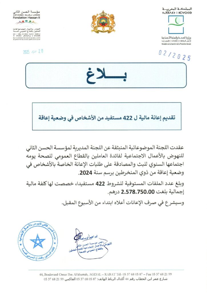 مؤسسة الحسن الثاني/ قطاع الصحة…بلاغ حول تقديم إعانة مالية ل 422 مستفيد من الأشخاص في وضعية إعاقة