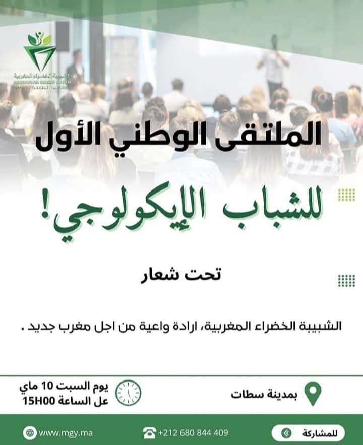 تنظم الشبيبة الخضراء المغربية الملتقى الوطني الأول للشباب الأيكولوجي، تحت شعار “الشبيبة الخضراء المغربية: إرادة واعية من أجل مغرب جديد”. يهدف هذا الملتقى إلى مناقشة قضايا البيئة والتنمية المستدامة في المغرب، وتبادل الخبرات والأفكار حول كيفية تعزيز العمل الأيكولوجي في البلاد.
