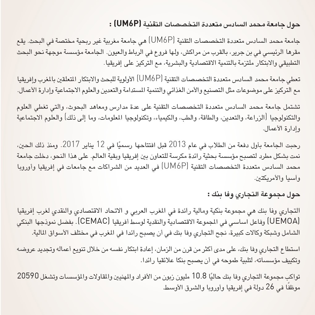* التوظيف والشراكة الأكاديمية : خلق التآزر حول دعم الشباب من أجل تعزيز قدراتهم التعليمية وتطوير مهارات جديدة. من خلال توقيع هذه الاتفاقية، تؤكد جامعة محمد السادس متعددة التخصصات التقنية التزامها المستمر بالبحث والابتكار وريادة الأعمال ورغبتها في تلبية الاحتياجات الحالية والمستقبلية للمشغلين الوطنيين. من جانبها، تؤكد مجموعة التجاري وفا بنك التزامها بتعزيز الإدماج المالي كأحد الأولويات الوطنية وتجندها لتعزيز ودعم ريادة الأعمال بجميع أشكالها.
