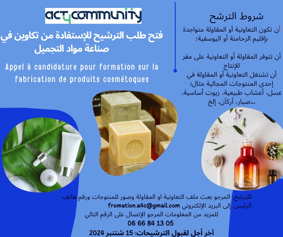 أكتفوركمينيتي كنتور… إعلان عن فتح الترشيحات للتعاونيات والمقاولات الصغرى المحلية للاستفادة من تكاوين في مجال صناعة مواد التجميل.